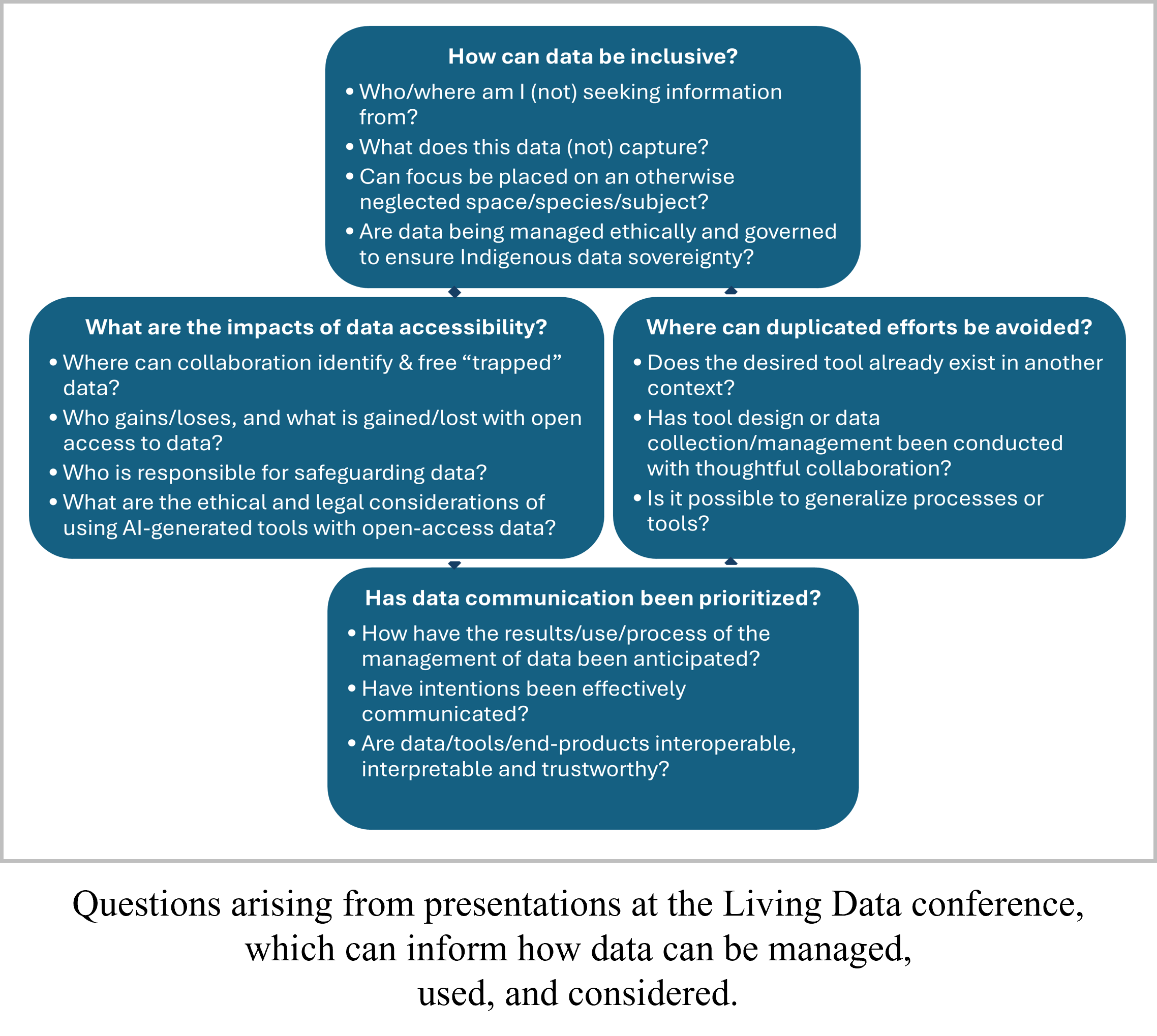 Throughout the conference, I attended sessions on topics ranging from global data infrastructure and DNA-derived biodiversity data to overcoming barriers in data sharing and strengthening community engagement. Among these topics was an interconnected web of questions and concepts that identified shared priorities and the need for thoughtful approaches to data. Summarized in the figure below and described in the following paragraphs, these questions can inform practitioners, software engineers, researchers, citizens, and avid learners in all fields on how to use, collect, communicate, and think about data.
