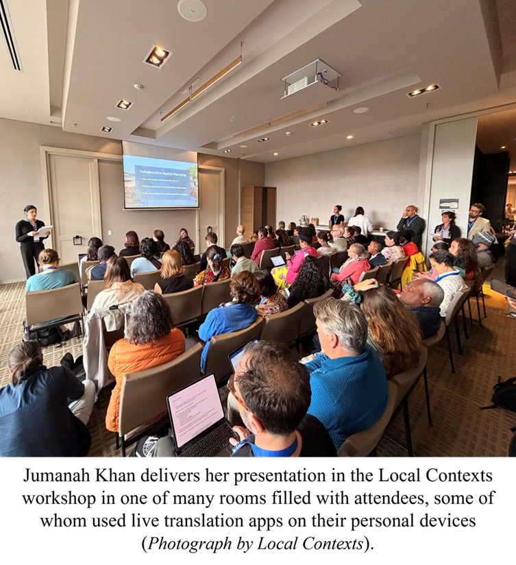 I was fortunate to receive support from Early Career Ocean Professionals and the Students on Ice Foundation to deliver my presentation as part of Local Contexts’ workshop, “Understanding Indigenous Data Provenance, the CARE Principles, and Local Contexts.” During the workshop, I shared insights from my study that explored the suitability of six decision-support tools–including a marine atlas, participatory mapping, ArcGIS StoryMap, and virtual reality–to collect and communicate place-based knowledge in a spatial planning context. My research examined how these tools can support knowledge representation throughout a planning process by highlighting the design and use limitations and identifying the characteristics and planning stages for impactful use. The workshop’s focus on Indigenous data sovereignty and innovative tools such as Labels and Notices provided a powerful forum to discuss ethical data governance and to share global case studies, directly aligned with the conference’s objectives to connect policy and science, foster interoperability, and expand access to the knowledge needed to monitor progress toward planetary conservation. This experience reinforced the importance of incorporating local contexts and knowledge systems to inform decision-making in changing environments, ensuring the tools and standards we adopt reflect, respect, and empower the communities they are meant to serve.